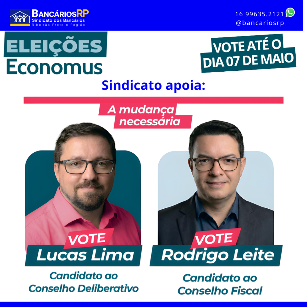 O Sindicato, assim como as demais entidades representativas dos trabalhadores, apoia os candidatos Lucas Lima, para o Conselho Deliberativo, e Rodrigo Leite, para o Conselho Fiscal, por serem comprometidos com a defesa dos interesses dos participantes, com foco na incorporação de todos os planos à Previ e Cassi, na luta por tratamento isonômico e na melhoria da gestão do instituto.