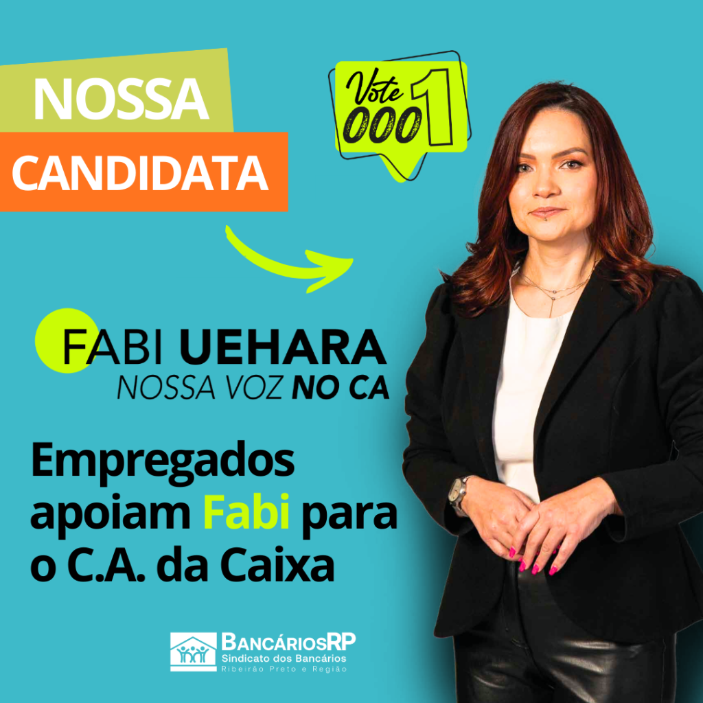 O Sindicato dos Bancários de Ribeirão Preto e Região se une à Confederação Nacional dos Trabalhadores do Ramo Financeiro (Contraf-CUT), a Fenae, APCEFs e diversas outras entidades representativas dos empregados da Caixa Econômica Federal para apoiar a candidatura e eleger Fabiana Uehara para a representação dos trabalhadores no Conselho de Administração (CA) do banco. A votação do primeiro turno acontece entre os dias 4 e 6 de março. Todas as empregadas e empregados da ativa têm direito a voto.